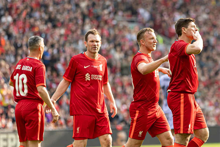 ทัพตำนาน "หงส์แดง" ซึ่งมี เซอร์ เคนนี่ ดัลกลิช และ เอียน รัช สองตำนานสโมสร คุมทีม โดย 11 คนแรกจัดมาในแท็กติก 3-4-3 มี ซานเดอร์ เวสเตอร์เฟลด์ เฝ้าเสา แนวรับเซ็นเตอร์แบ็กสามราย ประกอบด้วย เจมี่ คาร์ราเกอร์, ซามี่ ฮูเปีย และ แดเนี่ยล แอ็กเกอร์ โดยมีวิงซ้าย-ขวาอย่าง ฟาลิโอ ออเรลิโอ และ เกล็น จอห์นสัน ส่วนคู่กลางเป็น บียอร์น ทอเร่ ควาร์เม่ และ ซาลีฟ ดิเยา ขณะที่สามแนวรุกเป็น สตีเว่น เจอร์ราร์ด กัปตันทีม, เดิร์ค เค้าท์ และ หลุยส์ การ์เซีย ที่วันนี้มีชื่อเล่นให้ทั้งสองสโมสร