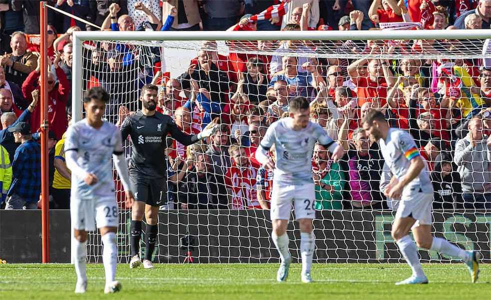 ลิเวอร์พูล พลาดโอกาสที่จะขึ้นไปรั้งอันดับ 5 ของตาราง พรีเมียร์ลีก เป็นการชั่วคราว หลังจากออกไปแพ้ น็อตติ้งแฮม ฟอเรสต์ ที่สนาม ซิตี้ กราวนด์ 0-1 เมื่อวันเสาร์ที่ 22 ตุลาคม ส่งผลให้ "หงส์แดง" ยังมีแค่ 16 คะแนนจาก 11 นัด รั้งอันดับ 7 เหมือนเดิม และมีสิทธิ์หล่นไปอีกเพราะลงเล่นก่อนทีมอื่น
